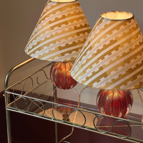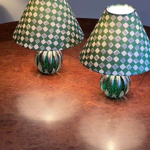 Vintage green/silver Murano table lamp with lampshade by Cathy Nordström. 2 available - price per pieceItaly circa 1970s, H31 cm (incl lampshade) Comes with cotton braided wire with switchGood vintage conditionBulb Specifications: B22 (Bayonet) BulbSold with lampshade. *Please contact us if you would like to request another lampshade for this lamp. See our selection here.
