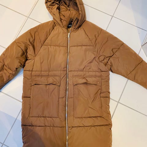 Dynejakke, Sort, Ubrugt, XL/XXL str 44-48, ny varm vatteret dynefrakke med pelskrave som kan tages af og plyds indvendig i hætten. Lommer . Skuldermål 50 cm, brystmål 120 cm, L 95 cm. Med strik i ærme kant.