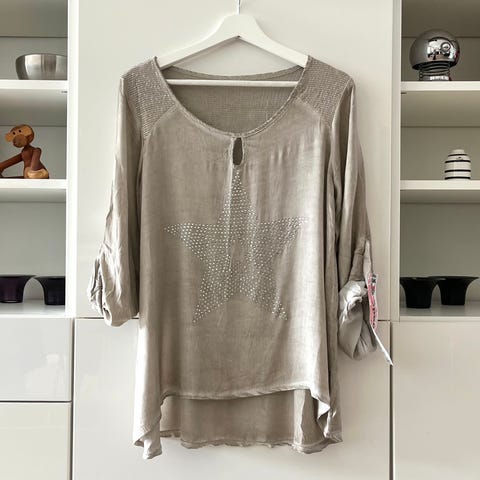 Blusen har rund hals med kighul ved halsudskæring foran. Den har fine shiny pailletter ved skuldre samt øverst bagpå.