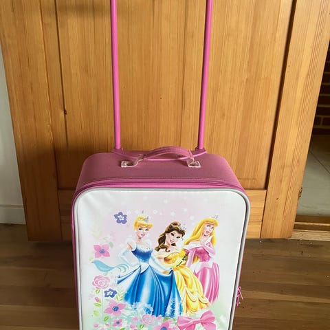 Disney prinsessekuffert i lyserød og hvid farve, lavet af plastmateriale.