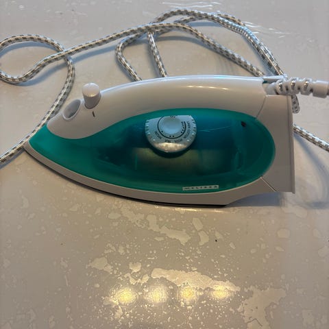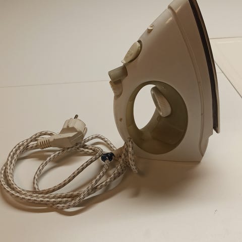 Melissa Steam Iron with 1800W power, featuring a white and blue design. Suitable for general ironing purposes, equipped with steam function for improved fabric care.