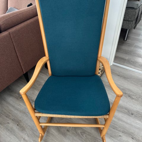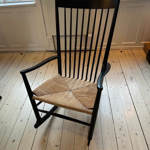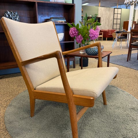 Denne J16 Wegner lænestol sælges billigt, da den ene fod er knækket. Den er dog gemt og sælges med, så man let kan få den sat på igen.