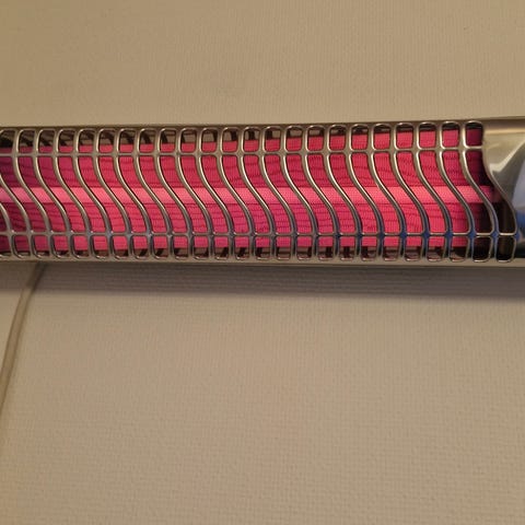 Brugt varmelampe. Kun brugt få måneder. Har to varmeniveauer (1-2). Kan skrues fast til væggen (se billede 3)