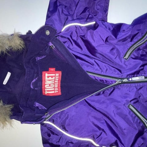 Flyverdragt i lilla farve med hætte og detaljer i lyserød, som ses ved håndled og halsåbning. Dragten har to lynlåse foran, som gør det nemt at tage den af og på. Den er velegnet til kolde vejrforhold for små børn.