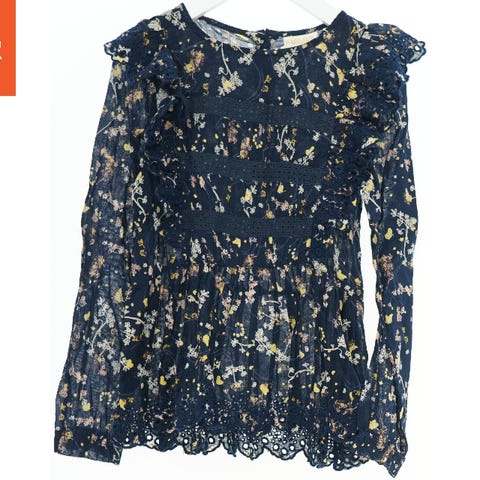 Langærmet bluse med blomsterblondemateriale. Blusen har en rund halsudskæring og lukkes bagpå med en enkelt knap. Ærmerne og blusens overflade er dekoreret med et blomstret blondemønster, som giver et elegant udseende. Stoffet er semitransparent på ærmerne og har et fast underlag på kroppen.