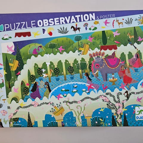 Djeco Puzzle Observation puslespil med 54 brikker, størrelse 61x38 cm (24x15 tommer). Indeholder en plakat og et puslespil med farverige illustrationer, der opfordrer til observation og opdagelse. Egnet til børn og voksne til udvikling af opmærksomhed og problemløsning.