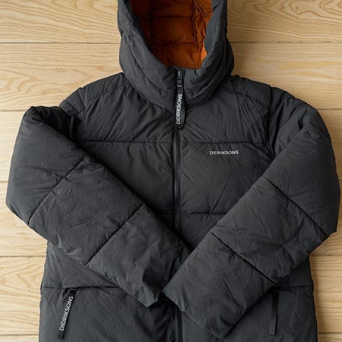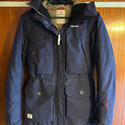 Didriksons vinterjakke i blå farve, størrelse 36 til kvinder. Jakken er 100% vandtæt og har quiltet foring for ekstra varme. Den har hætte med lille skygge for lav vinter sol og justerbare ærmer med hul til tommelfingeren. Materialet og designet er velegnet til kolde og våde vejrforhold.