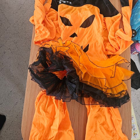 Unisex frø kostume i grøn og beige farve med sorte pletter og blå halstørklæde. Kostumet passer til personer med en højde på 155-190 cm (61,02-74,8 tommer). Den er brugt kun én gang