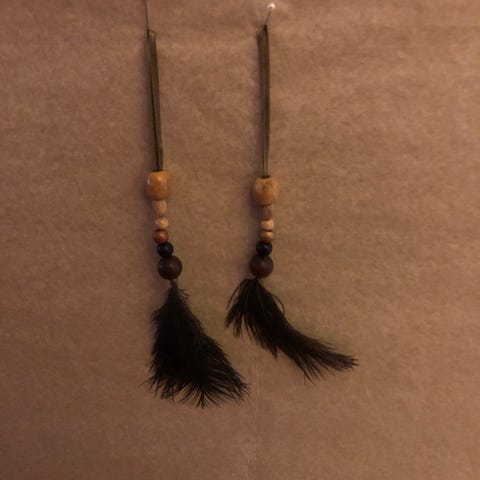 Perleophæng med rød kæde og fjer