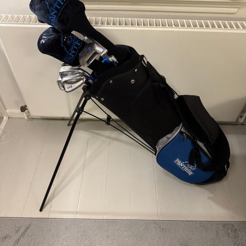Panther X3 golfkøllesæt med taske i blå og sort farve. Sættet inkluderer flere køller med forskellige hoveder og størrelser, samt en bære-/standtaske med ben til at stå oprejst. Materialet på køllerne er metal, og tasken er designet til nem transport af golfudstyr.
