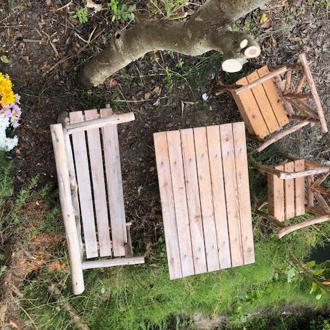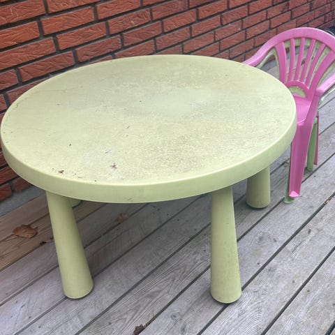 Udendørs cafebord og to stole i metal med blåmalet finish til børn. Bordet har rund bordplade og stolene har høj ryg med armlæn. Møblerne er velegnede til have eller terrassebrug.