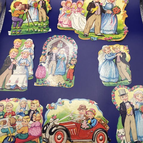 Sælger her to store glansbilleder med motiver af brude. De måler i højden (længden) ca. 23,5 cm. Virkelig fine i motivet. Prisen er for begge brude/glansbilleder.