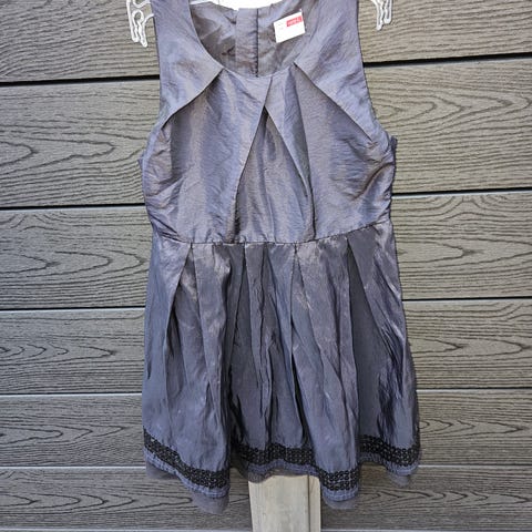 Flot festkjole i mørkelilla satin med et velourbånd i taljen, velour mønster på underdelen, samt et fint tyl underskørt. 2 af billederne er taget i solskin for at vise det fine satinstof 💃
