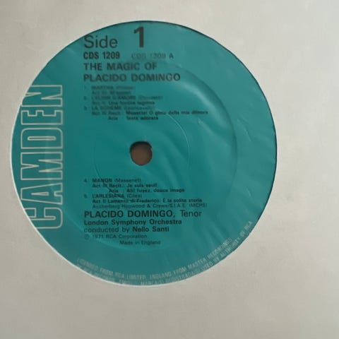 Placido Domingo Das große Album vinylplade med klassiske musiknumre. Udgivet af RCA Red Seal. Indeholder værker af komponister som Mozart, Wagner og Verdi. Stereooptagelse med flere sider og spor. Sort vinyl med rødt label.