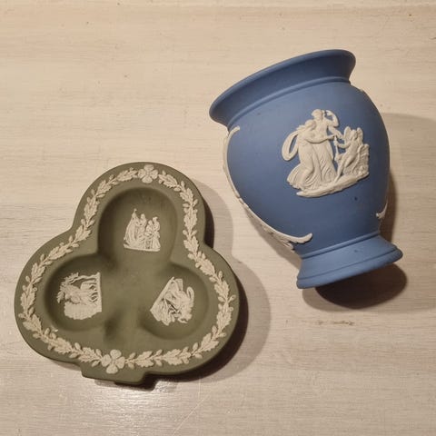 Wedgwood Jasperware. Sæt med lågkrukke, skål og vase