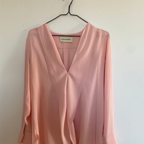 By Malene Birger bluse eller tunika helt afhængigt af hvad størrelse den enkelte er. Blusen er i størrelse angivet til størrelse 36 og med et brystmål på cirka 110 cm og en længde på cirka 68 cm vil den fungere som tunika. For personer der bruger lidt større størrelser vil den fungere som bluse. Bemærk at blusen er i meget let materiale og at det er 100% silke.