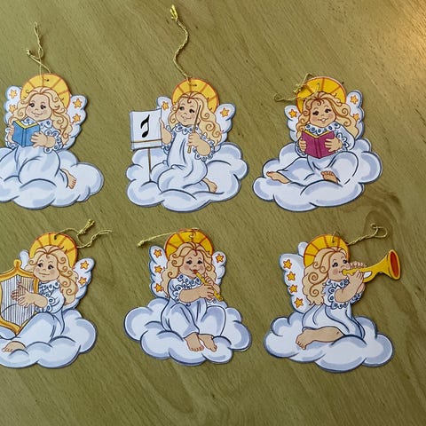 Æske med 12 engle i guldfolie med sølvfarvede hoveder. Fra 1970'er. De kan både hænge og stå. Højde 7,5 cm. Alle I rigtig flot stand på nær en hvor kjolen er lidt krøllet, se billede 3.