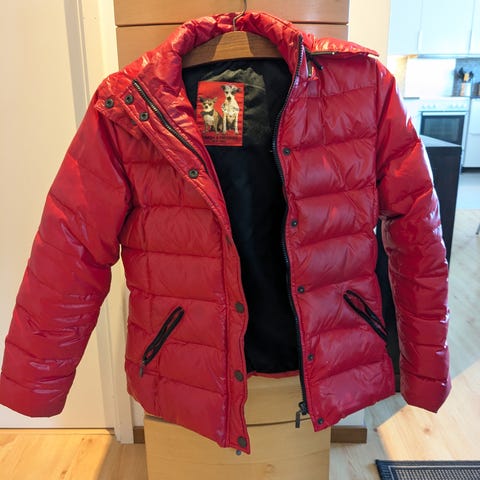Længde fra skulder til nederste kant: 90 cm. Pelskant kant lynes af hætten. Hætten kan deruden lynes af jakken. Lidt slidt ved ærme - se foto.