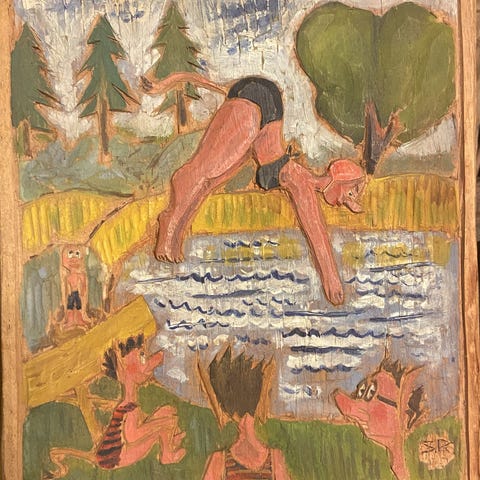 Unikt kunst på træ med motiv af blå huse. Dekorationen er lavet af træ og viser en række huse i forskellige blå nuancer med detaljer i hvid og sort, sender gerne.