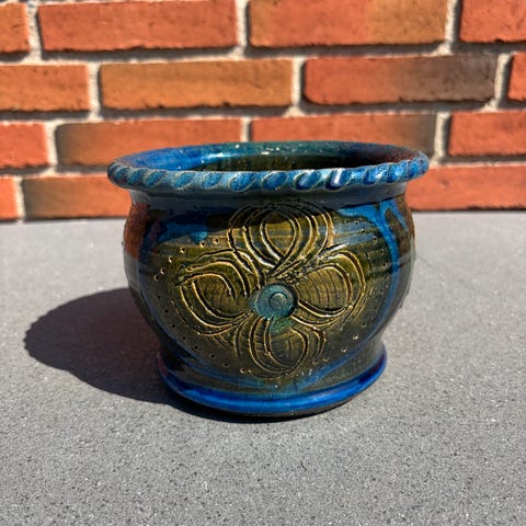 Flot stor blå urtepotteskjuler lavet af den anerkendte danske keramiker Carin Kramp.