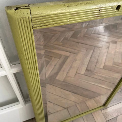Spejlet har et klistermærke på samt to tegninger malet med det man kan male på vinduer med. Tænker det sagtens kan fjernes