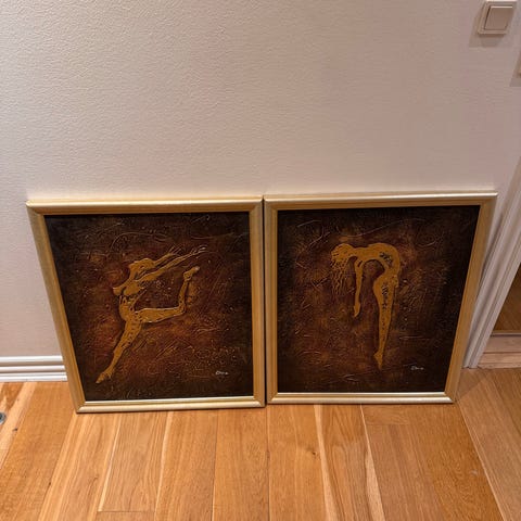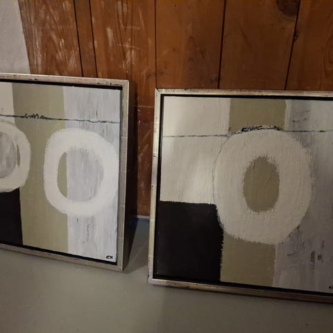 Sæt bestående af 2 abstrakte malerier med cirkulære og geometriske motiver. Farverne inkluderer rød, grå, sort og hvid. Malerierne har en struktureret overflade og kan anvendes som vægdekoration i forskellige rum.