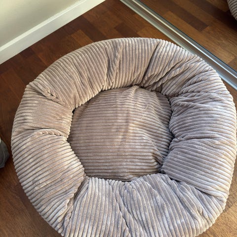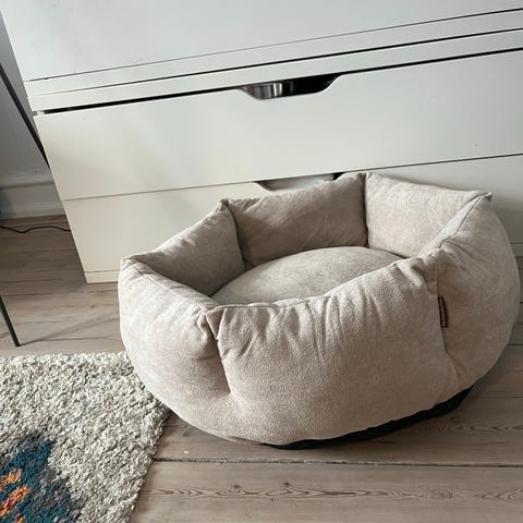 Luksuriøs hundekurv i smuk mørkeblå fløjl. Virkelig blød og skøn. Betrækket kan tages af og vaskes i maskinen ved 40 grader. Købt på bydoodledog.dk det er den model der hedder Elva.