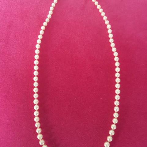 Kæden er afsluttet med en smuk, dekorativ sølvlås, der tilføjer et eksklusivt og tidløst præg. Perlerne fremstår i flot, velholdt stand med fin glans og et klassisk udtryk, som gør den ideel både til hverdagsbrug og festlige lejligheder.