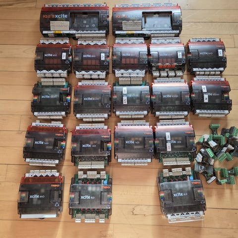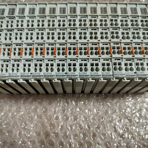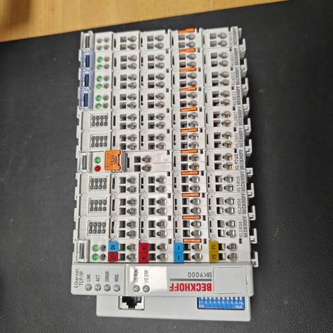 Beckhoff EK1100 EtherCAT Controller Modul, Beckhoff EM7004 EtherCAT-modulgrænseflade til tilslutning af 4 servodrev. Beckhoff IO Moduler: EL9100-2stk, EL2008-5stk, EL1008-5stk, EL2622-3stk, EL2612-1stk, EL6021-1stk.