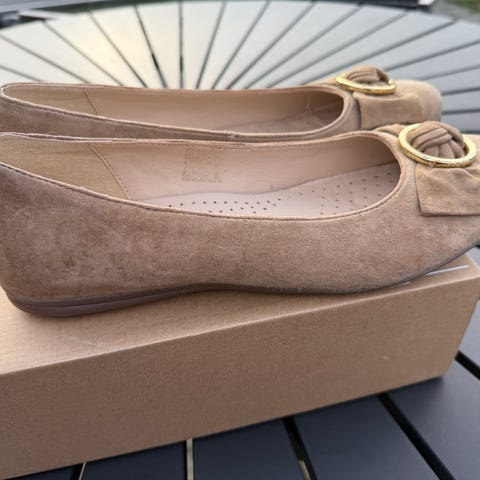 Super smart ballerina fra Softwalk til damer. Den er lavet af ruskind i en flot beige farve. Foran er der en sløjfe med et guld spænde, som giver et smart look. Indvendigt er den foret med lyst skind og har en dæksål ligeledes i skind. Slidsålen er lavet af naturbrunt gummi, så man står godt fast. Rigtig flot ballerina til damer.