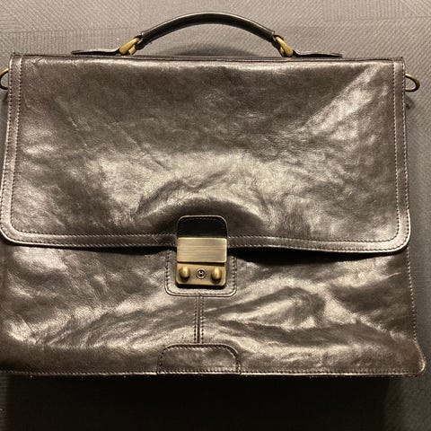 Ægte åleskinds attachemappen i meget flot stand og meget slidstærk sælges. Tasken har et struktureret ydre med synlige sømme og metalbeslag. Indvendigt er der flere rum og lommer til organisering af dokumenter og småting. Materialet er ruskind og læder med en blød inderside, hvilket gør den egnet til opbevaring af forskellige genstande. Tasken har et håndtag til bæring.
