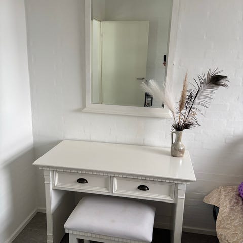 Har stort rundt spejl samt i alt 4 små skuffer + 2 større skuffer, perfekte til makeup, hårpynt og småting.