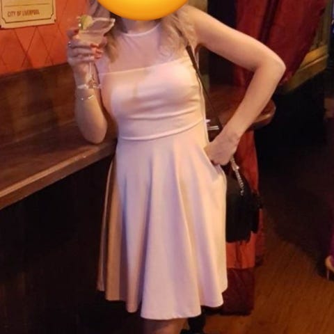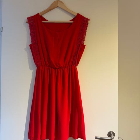 Kjolen har en løs pasform med let gennemsigtigt materiale og dekorative detaljer ved halsudskæringen. Egnet til formelle lejligheder.