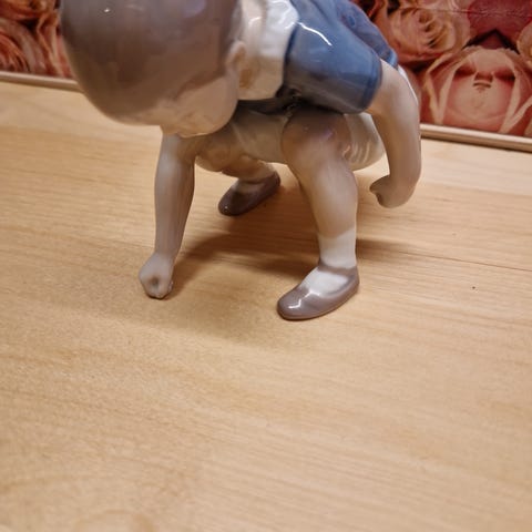 Bing og Grøndahl, Porcelænsfigur af en dreng i blå trøje og hvide shorts, der sidder på hug. Figuren er detaljeret med naturlige farver. Lavet 1952-57. Meget fin stand.