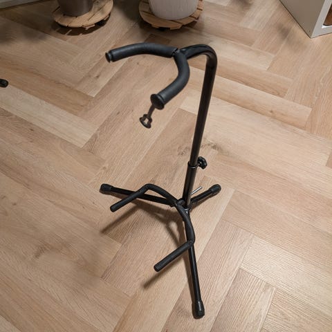 Guitarudstyr Stativ til guitar med justerbar højde og stabil base. Designet til at holde guitarer sikkert i stående position. Fremstillet i metal med polstrede støttepunkter for at beskytte instrumentet mod ridser. Velegnet til forskellige guitarstørrelser og modeller.
