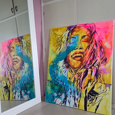 Farverigt portræt maleri på lærred med abstrakte elementer. Maleriet viser en kvindes ansigt med levende farver som rød, orange, blå og grøn. Materialet er lærred, og maleriet er egnet til indendørs vægdekoration. Moderne maleri udført på lærred. Maleriet er karakteriseret ved brug af levende og kontrastfulde farver. Maleriet måler 100x120 cm og malet med akrylmaling på lærred. Koster 4900 kr.
