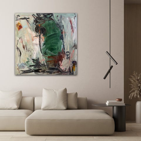Originalt abstrakt maleri med en kombination af blå, rød og sorte farver. Maleriet er 70x50 cm i størrelse og udført med forskellige maleteknikker, der skaber en dynamisk og farverig komposition.