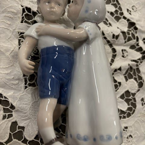 Bing og Grøndahl, Porcelænsfigur, der forestiller en piger, som forsøger at kysse en dreng. Figuren er detaljeret med drengen iført blå shorts og hvid skjorte, og pigen iført hvid kjole og hovedbeklædning. Figuren har en glaseret overflade og står på en grøn base. Design Ingeborg Plockross Irminger.