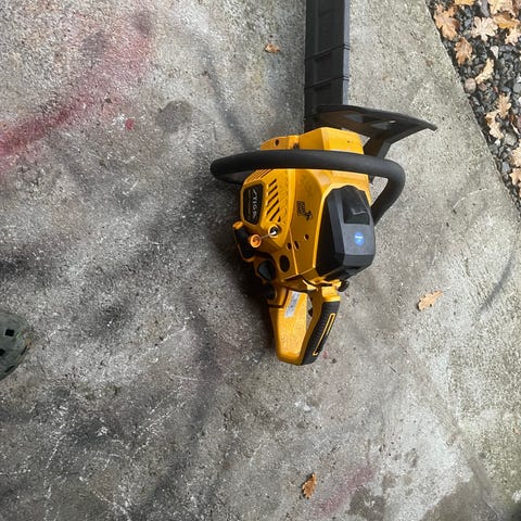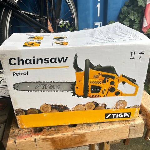 Aldrig været startet op. Der er 2 års garanti på saven. Nypris 3475 kr. Fast pris.