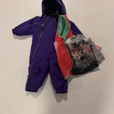 En flyverdragt og 2 jakker og en fleecejakke og