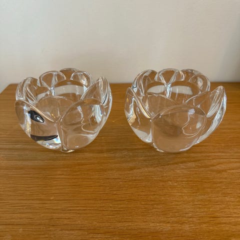 Glas, Kertestage, Holmegaard, Holmegaard lysestager til kertelys 3 kantet form i aquablå. Den ene har et lille hak invendig i kanten, men kan sagtens bruges. En side måler 6 cm. Samlet pris kr 50.