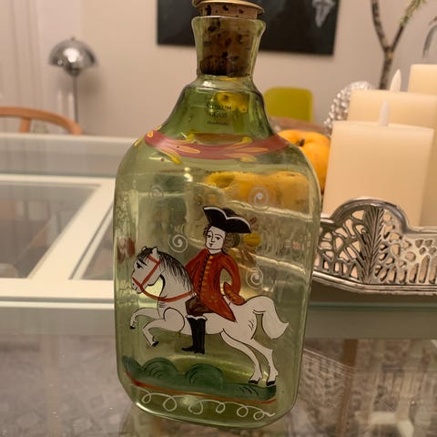 I låget er der et korkstykke med fjeder til at holde glaslåget fast. H: 15,2 cm., Ø: 5,5 cm.