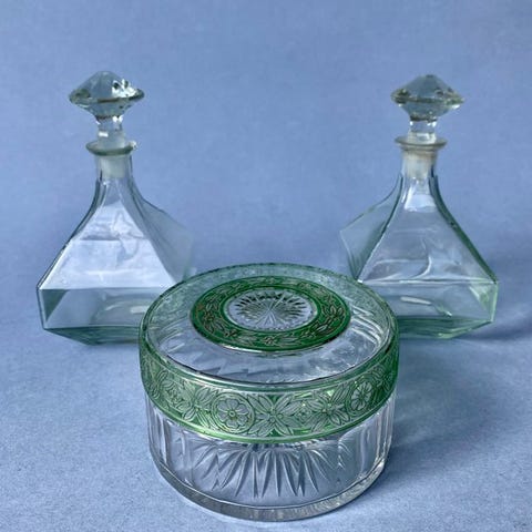 Art deco - antik fransk rejse glasflaske med glasprop i metalholder.