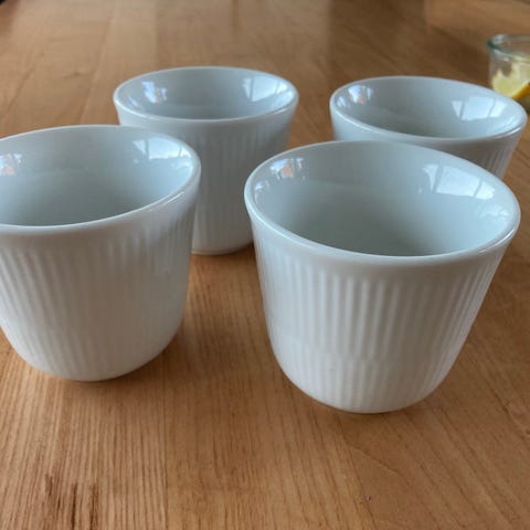 Kopperne er i kvalitetsporcelæn med den elegante riflede struktur og klassiske blondecirkel – perfekte til kaffe, te eller varm kakao, og de holder rigtig godt på varmen.