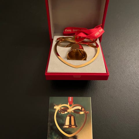 Georg Jensen Jule Uro juleophæng fra 1985, designet til jul. Fremstillet i guldfarvet materiale med dekorationer af rensdyr og klokke. Leveres i original rød gaveæske med rød sløjfe mærket "1985 Christmas Noël Jul". Velegnet som julepynt.