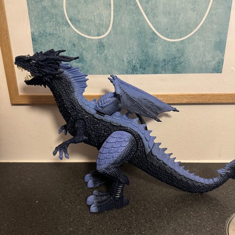 Drage med lys i næsen og munden. Mangler den ene arm. Er sjov at lege med, fordi den ser meget ond ud. Vingerne kan tages af. Fast pris.