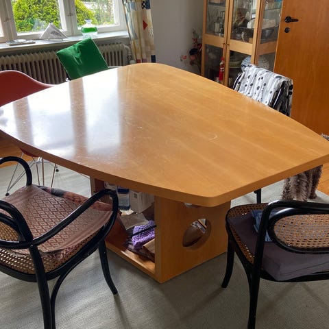 Designerbord fra dk3 i massivt douglasgran, staveopbygget og med original messingplade. Mål: 200 × 100 cm. Fremstår i god stand med almindelig, jævn brugspatina. Stabil konstruktion, ingen løse samlinger.