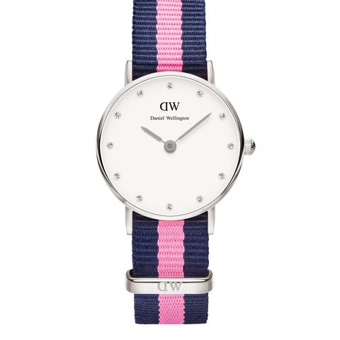 Uret har en NATO-rem i mørk blå og pink, og en elegant hvid urskive udsmykket med 12 Swarovski-krystaller som indekser.
