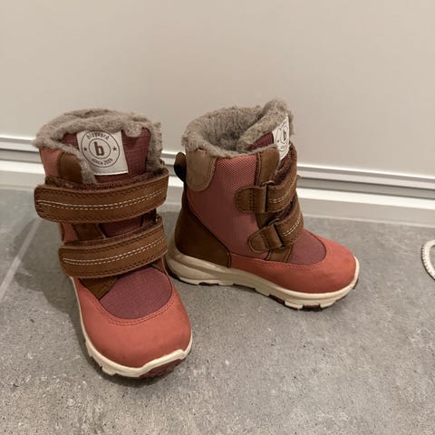 Bisgaard børnestøvler til pige i størrelse 24. Støvlerne er lavet af brunt læder og har en foret inderside for ekstra varme. De lukkes med to velcrobånd foran og har en robust sål med mønster for bedre greb. Velegnede til udendørs brug i koldt vejr.