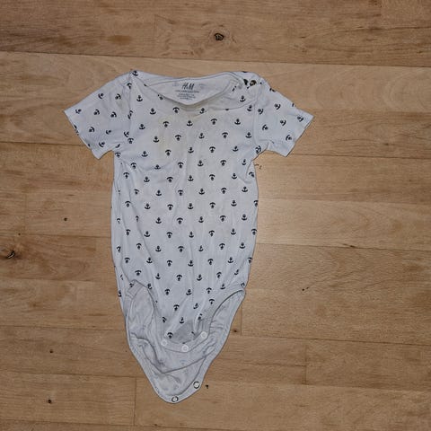 H&M Basic Bodystocking i størrelse 68, beige farve, lavet af økologisk bomuld. Designet til unisex børn. Kortærmet bodystocking med knaplukning ved skulderen for nem påklædning.